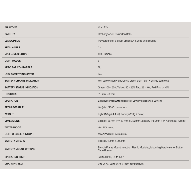 • Montage rapide et sécurisé sur guidon ou casque, résistance aux vibrations, recharge USB-C avec indicateurs de charge.