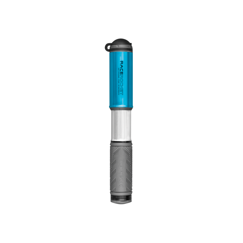 Pompe TOPEAK alu route vtt RaceRocket Bleue, raccord souple Presta Schrader, 9.6 bars, 140 psi, 85gr, long.18cm, ppc 39.95 €ttc.