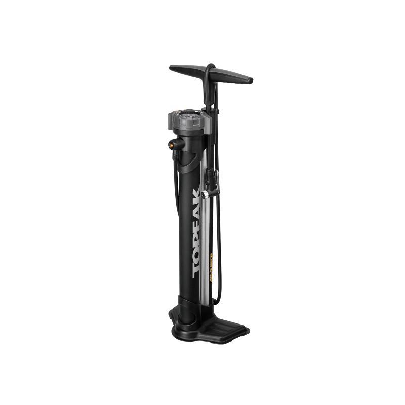 Pompe à pied TOPEAK alu JoeBlow Booster Tubeless argent décor noir, raccord intelligent Presta Schrader,