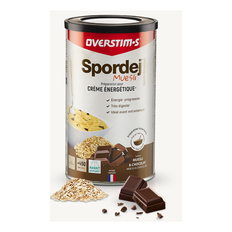 Aliment avant l'effort OVERSTIM'S Spordej, 700 gr, musli chocolat, préparation digeste avant et après l'effort, POT.