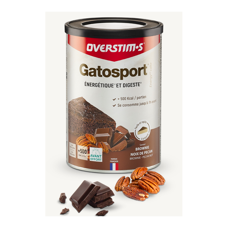 Gatosport OVERSTIM'S, 400 gr, Brownie chocolat-noix de pécan, Repas énergétique et digeste avant l'effort, BOITE.